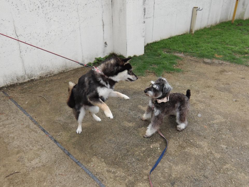 犬達も新入り犬を見つけると興味津々だったり、初めて遊びを