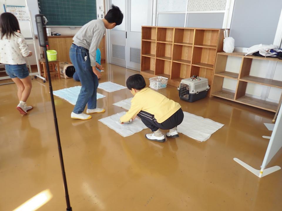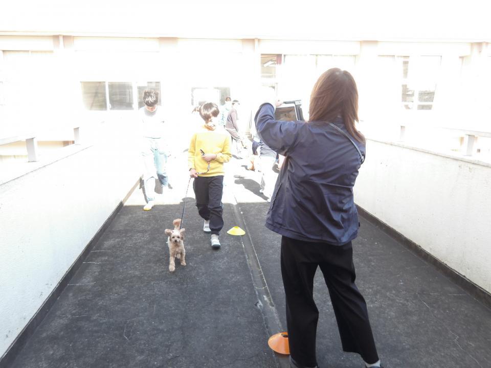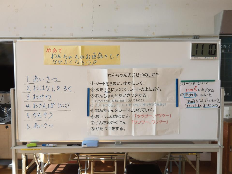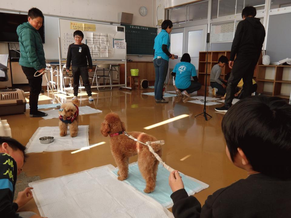 児童が犬達と触れ合う機会が多くなるように4クラスを2つに